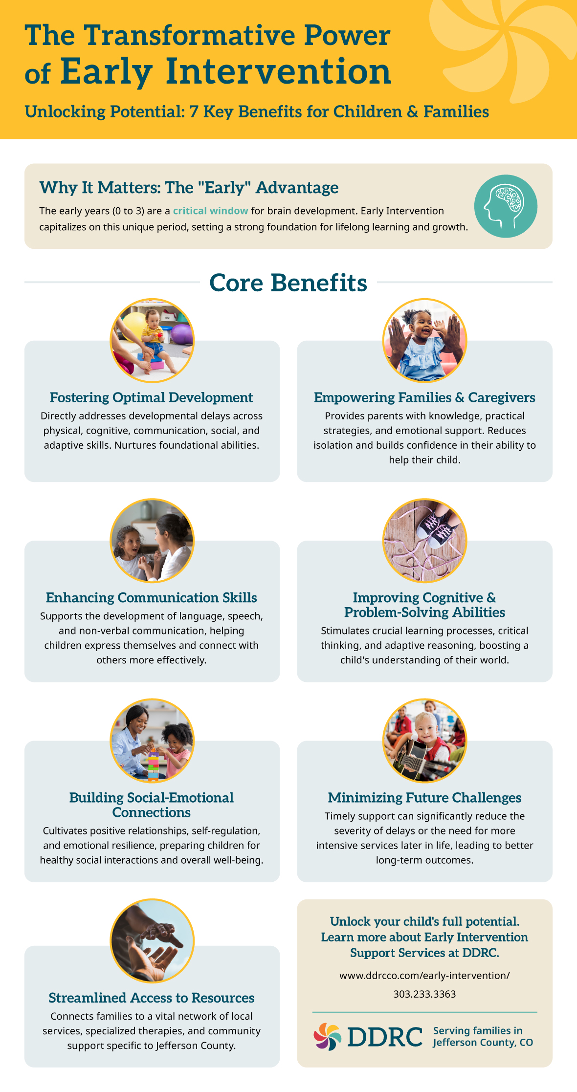 As the designated Early Intervention provider for Jefferson, Clear Creek, Gilpin, and Summit counties, DDRC has been a trusted partner for families across Colorado for decades. Our team includes speech-language pathologists, occupational therapists, physical therapists, developmental specialists, and service coordinators who are deeply committed to helping every child succeed.